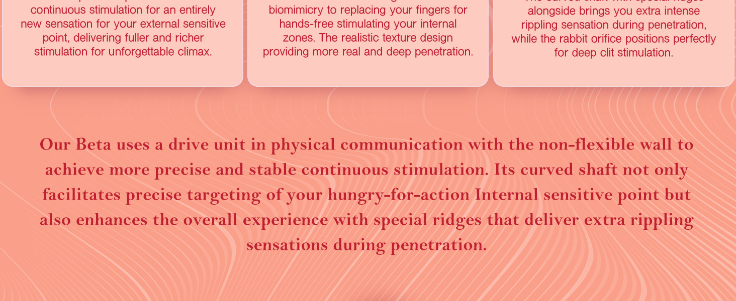 Using a unique drive unit that interacts with a rigid wall, Beta offers precise and stable continuous suction. Choose from 3 powerful suction modes to explore a variety of delicious sensations tailored to your desire.